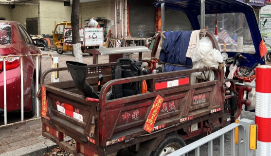 横沥振兴西路环卫工人三轮车故意阻挡车道